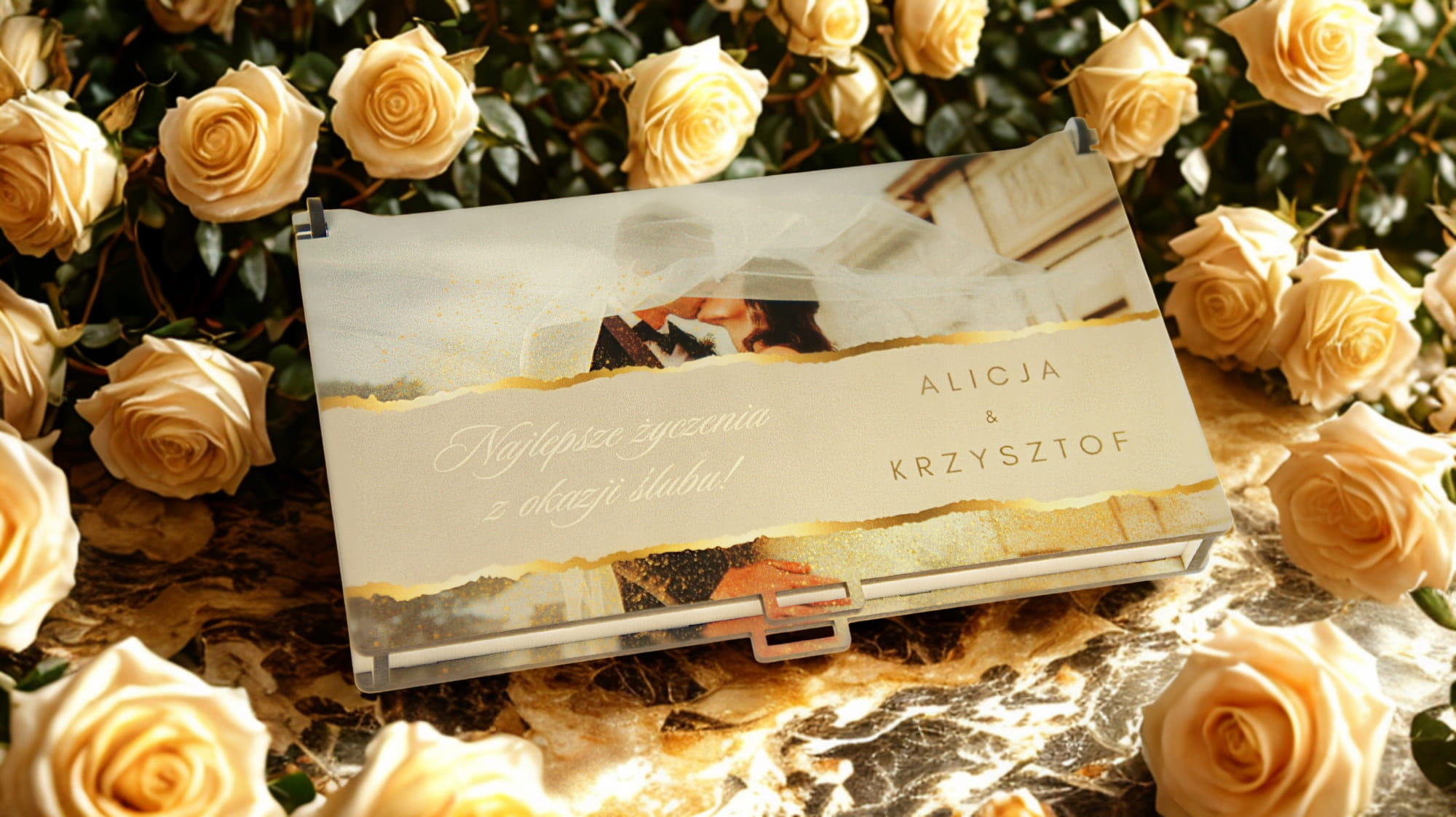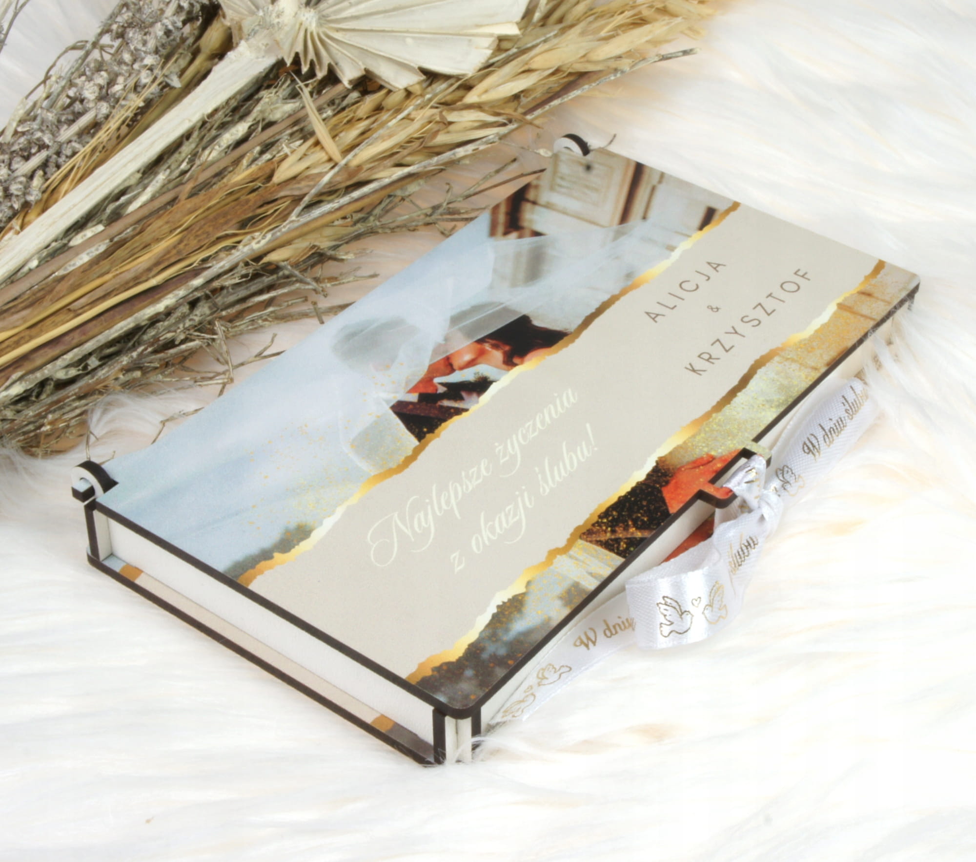 - Personalizacja – front (imiona), data, miejscowość, wnętrze (życzenia).