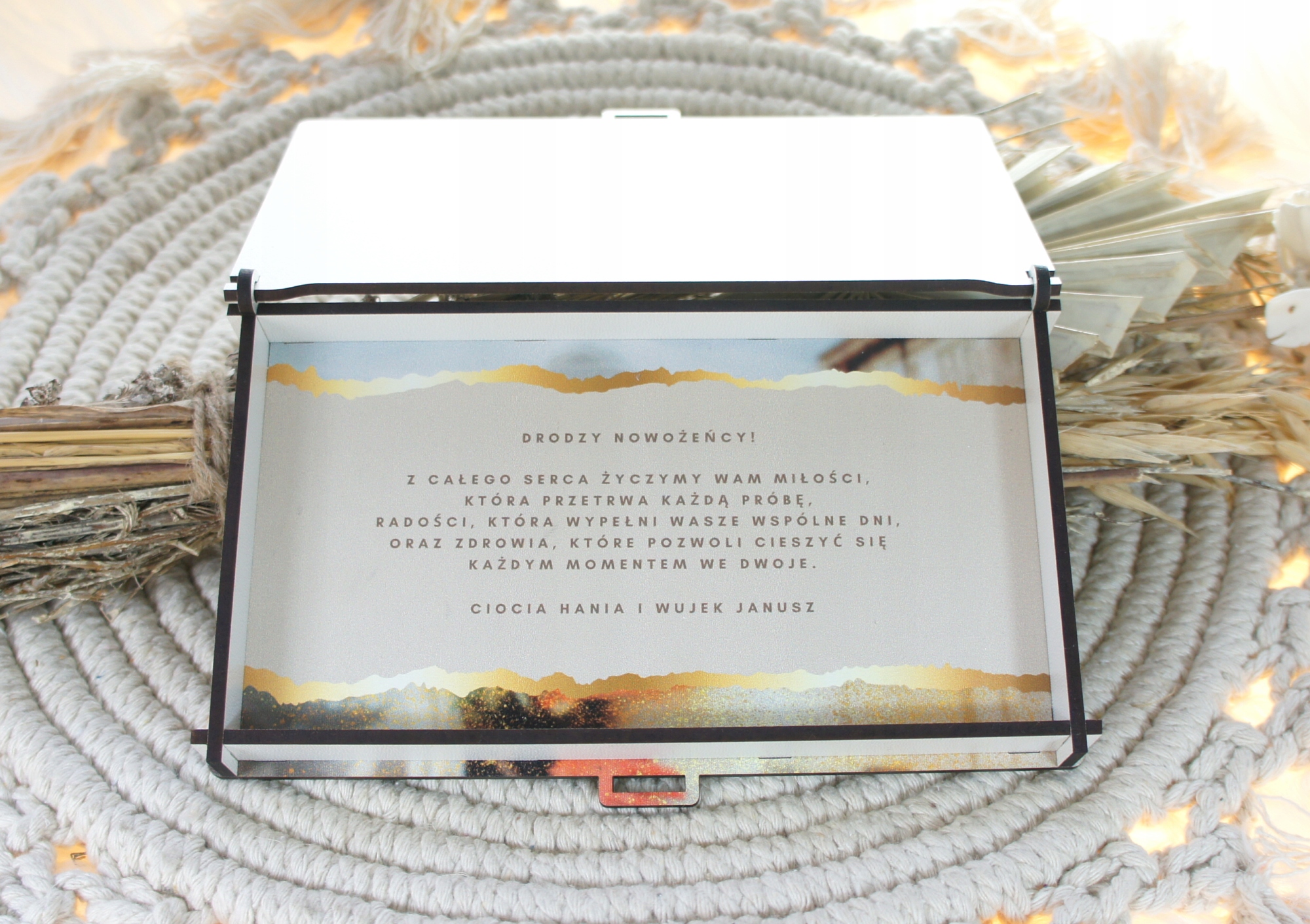 Nasze drewniane pudełko na pieniądze z odpornym na uszkodzenia nadrukiem UV to stylowy sposób podarowania pieniędzy. Na podstawie przesłanych przez Ciebie danych zmienimy grafikę tak, by stworzyć pudełko gotowe do wręczenia na prezent. To nie tylko opakowanie na pieniądze — to pamiątka na lata.