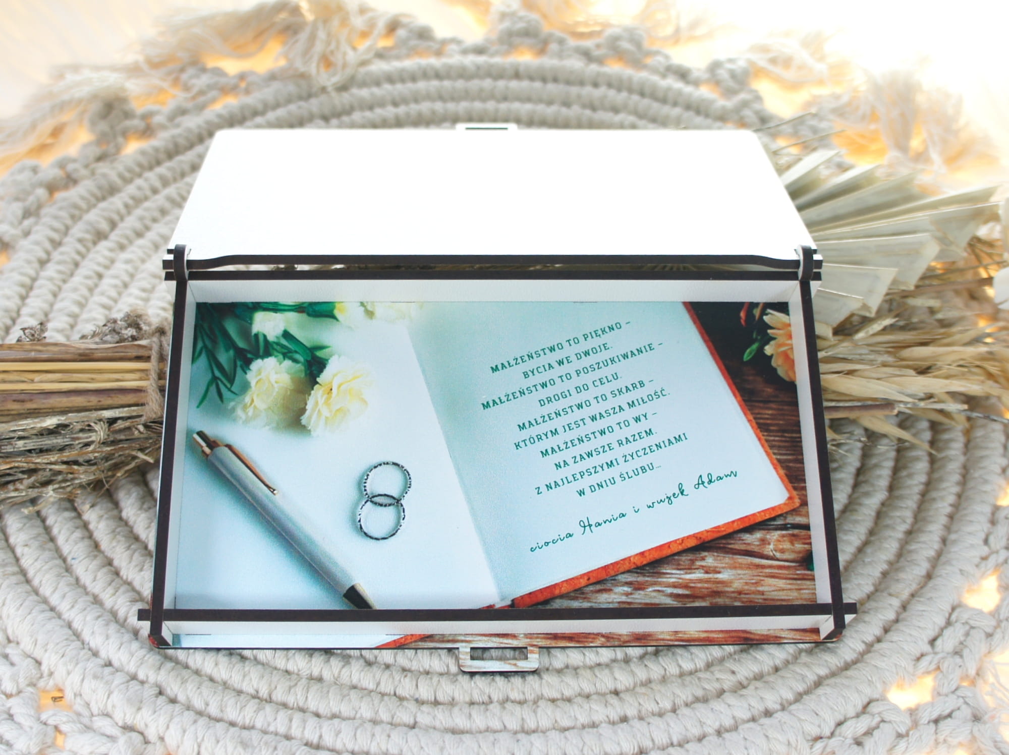 Nasze drewniane pudełko na pieniądze z odpornym na uszkodzenia nadrukiem UV to stylowy sposób podarowania pieniędzy. Na podstawie przesłanych przez Ciebie danych zmienimy grafikę tak, by stworzyć pudełko gotowe do wręczenia na prezent. To nie tylko opakowanie na pieniądze — to pamiątka na lata.