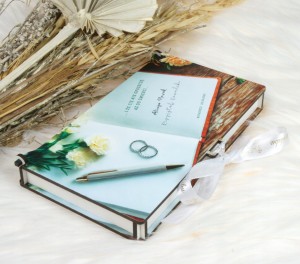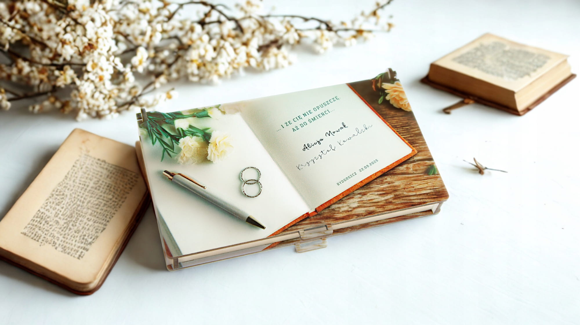 - Personalizacja – front (imiona), data, miejscowość, wnętrze (życzenia).